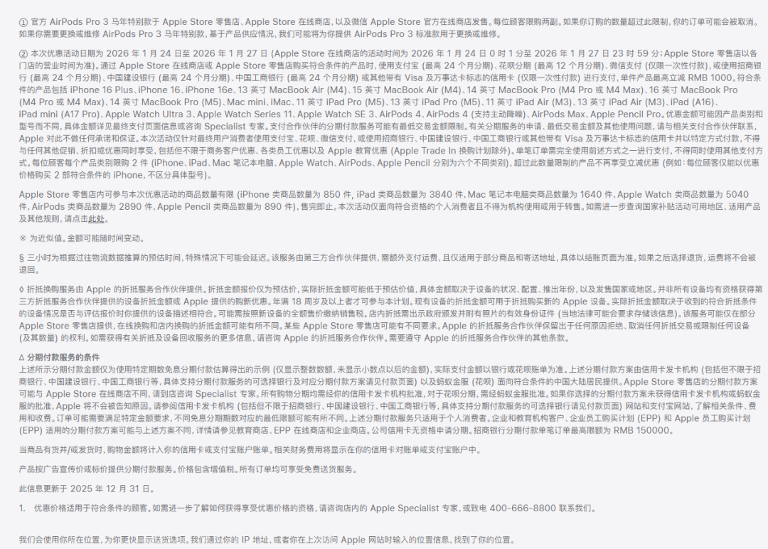 1月24日,据苹果中国官网Apple Store显示,新春限时优惠活动于1月24日-27日开启。